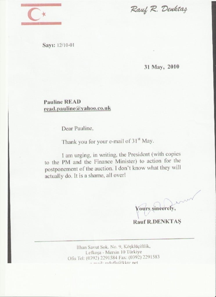 President Denktas was a man of vision, he wanted a better future for everyone living in North Cyprus, he rightfully saw expats as assets of the country, not cash cows to milk until they squeaked. Pauline Read has many, many emails from Mr Denktas. She met with him on many occasions. She has allowed me to share with you an email she received on the 31 MAY 2010, just 5 days before the Auction of Kulaksiz 5 site. You will see, the Government were even ignoring his pleas. They treated him in his lifetime as a spent force, will they disgrace his memory now that he is a dead HERO. May God forgive them.