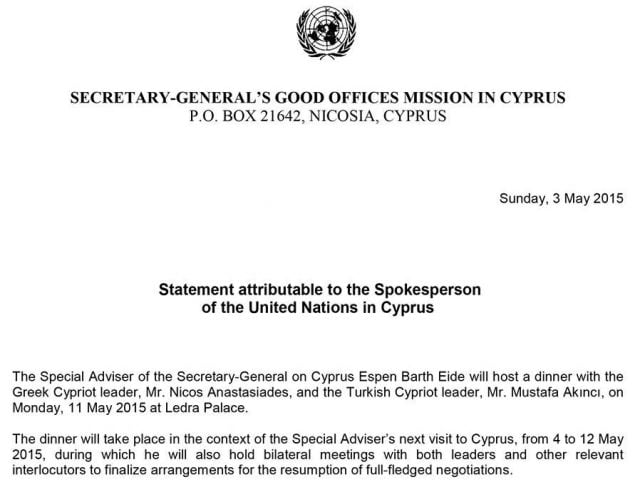 This simple message from the UN Secretary General’s Office announces that talks about Cyprus Talks started yesterday and will end on the 12th May 2015.