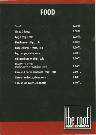 OK, the drinks were Sprites and Colas and the meals were burgers and chips or pizza but for a family trying to holiday on a budget this has to be a bargain. Food was excellent, especially the pizza, and good portions. The standard deal was a meal and a soft drink for 5, 6 or 7TL. A 50cl beer or a 17cl glass of house wine was 3 TL. See the full menu below.