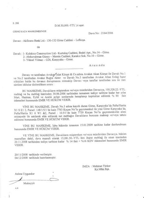 Now to a very serious subject, you will recall I publicly asked why Akfinans Bank Limited had a Court judgement in this matter in June 2006. I now know. In lay-man’s terms, the judgement said that if Yuksel Yilmaz and Abdurrahman Guney acting for and on behalf of Kulaksiz Construction Ltd did not satisfy the mortgage they had on our homes, then AKFINANS BANK LIMITED could apply the quarterly rate of 80% interest compound on this debt. Since the loan was taken out on the 11th November 2005 and we are talking about June 2006, it was still at a manageable amount. Akfinans Bank Limited had absolutely no incentive to involve us then, here they were with this wonderful earner and a legally sanctioned usury rate.